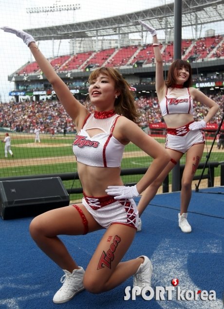 2일 오후 광주-기아챔피언스필드에서 열린 ‘2015 타이어뱅크 KBO 리그 프로야구’ KIA 타이거즈와 SK 와이번스의 경기에서 KIA 치어리더가 팬들의 흥을 유도하는 공연을 펼치고 있다.