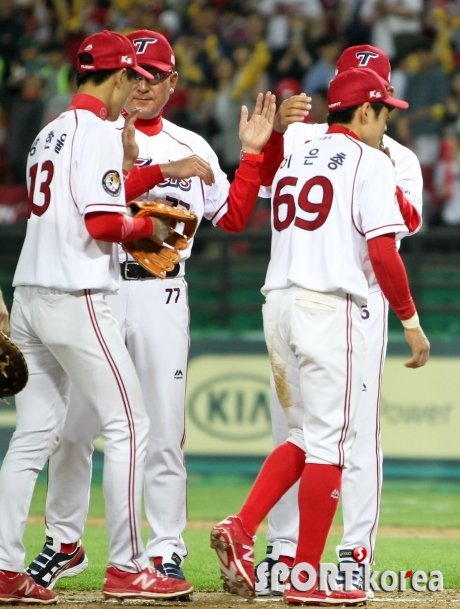 2일 오후 광주-기아챔피언스필드에서 열린 ‘2015 타이어뱅크 KBO 리그 프로야구’ KIA 타이거즈와 SK 와이번스의 경기에서 8회말 2사 만루 때 싹쓸이 3타점 2루타를 치며 팀의 승리를 이끈 KIA 9번 이은총이 경기를 마치고 김기태 감독과 하이파이브를 나누고 있다.