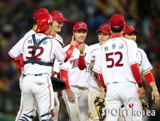 KIA는 2일 광주-기아 챔피언스필드에서 열린 2015 타이어뱅크 KBO리그’SK와의 경기에서 2-2로 맞선 8회 2사 만루에서 이은총의 싹쓸이 3타점 2루타로 5-2로 이겼다. 경기를 마치고 KIA 선수들이 이은총을 중심으로 승리의 기쁨을 나누고 있다.