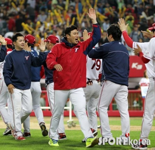 KIA는 2일 광주-기아 챔피언스필드에서 열린 2015 타이어뱅크 KBO리그’SK와의 경기에서 2-2로 맞선 8회 2사 만루에서 이은총의 싹쓸이 3타점 2루타로 5-2로 이겼다. 경기를 마친 서재응이 동료들과 하이파이브를 나누고 있다.