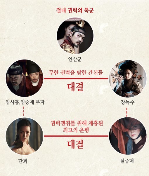 먼저 최악의 간신 임숭재(주지훈)와 아들을 앞세운 야심가 임사홍(천호진), 희대의 요부 장녹수(차지연)가 팽팽한 대결 구도를 형성한다. 천년 이래 으뜸 가는 간흉이라 역사에 기록된 최악의 간신 부자 임숭재-임사홍과 왕의 총애를 받아 손에 넘치는 권력을 쥔 장녹수. 칼날 같은 긴장감이 감도는 가운데 과연 누가 연산군의 마음을 사로잡아 최고의 권력을 거머쥘 수 있을지 궁금증이 증폭된다.