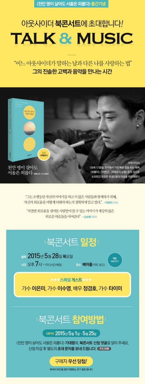 특히 아웃사이더와 스페셜 게스트들이 선사할 특별한 무대와 아웃사이더의 솔직한 이야기를 한 자리에서 만날 수 있는 아웃사이더의 첫 번째 산문집 <천만 명이 살아도 서울은 외롭다> 출간 기념 북 콘서트 ‘TALK & MUSIC’은 현재 온라인 서점 예스24, 알라딘, 교보문고, 인터파크 등의 이벤트 페이지에서 댓글로 신청을 받고 있다.