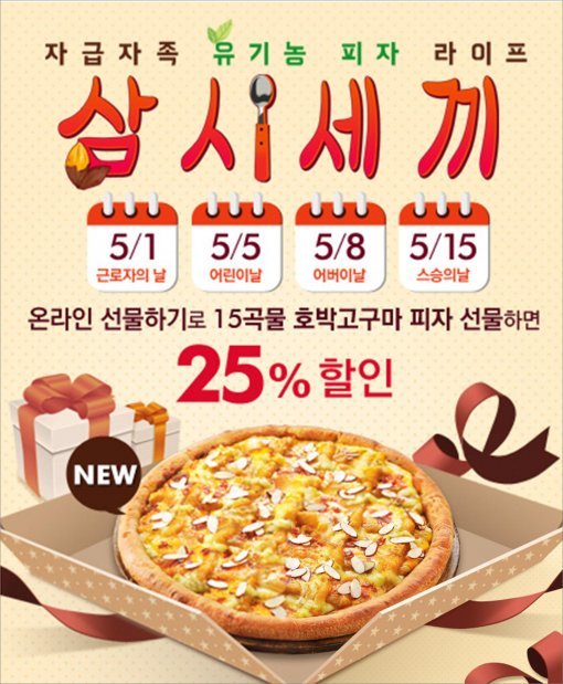 도미노피자(www.dominos.co.kr, 대표 오광현)가 가정의 달 5월을 맞아 ‘선물하기’ 이벤트를 펼친다. 8일 어버이날, 15일 스승의 날에 ‘선물하기’ 기능을 이용하면 신제품 호박고구마피자를 25% 할인된 가격에 구매할 수 있다. 호박고구마피자는 국내산 15곡물로 만든 웰빙 도우와 국내산 호박고구마로 만든 고구마무스를 토핑해 건강한 맛을 듬뿍 담은 도미노피자의 신제품이다. 홈페이지 및 모바일(웹, 앱)에서 이용할 수 있으며 여타할인과 중복할인도 가능하다.