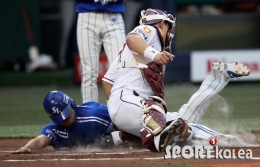 7일 오후 서울 목동야구장에서 열린 ‘2015 타이어뱅크 KBO 리그’ 넥센 히어로즈와 삼성 라이온즈의 경기 삼성 2회초 1사 1,3루에서 3루주자 이지영이 1루주자 박해민과 더블스틸을 시도했으나 홈에서 넥센 박동원에게 태크아웃 되고 있다.