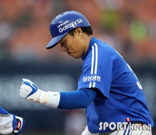 7일 오후 서울 목동야구장에서 열린 ‘2015 타이어뱅크 KBO 리그’ 넥센 히어로즈와 삼성 라이온즈의 경기에서 삼성 6번 지명타자 이승엽이 2회초 무사 1,2루에서 1타점 중전 적시타를 치고 1루에서 김평호 코치와 주먹을 마주치고 있다.