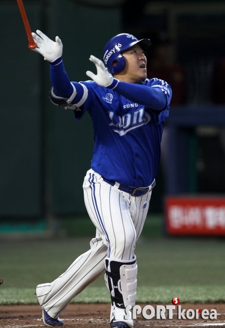 7일 오후 서울 목동야구장에서 열린 ‘2015 타이어뱅크 KBO 리그’ 넥센 히어로즈와 삼성 라이온즈의 경기에서 삼성 4번 최형우가 3회초 1사 후 비거리 125미터 우중월 솔로홈런을 날리고 있다.