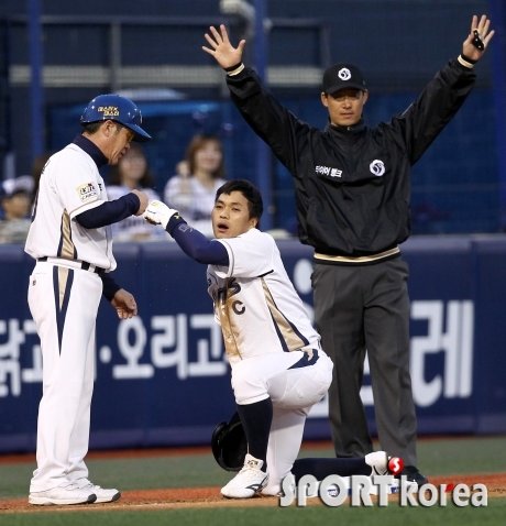 7일 오후 창원 마산야구장에서 열린 ‘2015 타이어뱅크 KBO 리그’ NC 다이노스와 KIA 타이거즈의 경기 2회말 1사 1루에서 NC 1루주자 이종욱이 지석훈의 우전안타 때 3루까지 진루하고 있다.