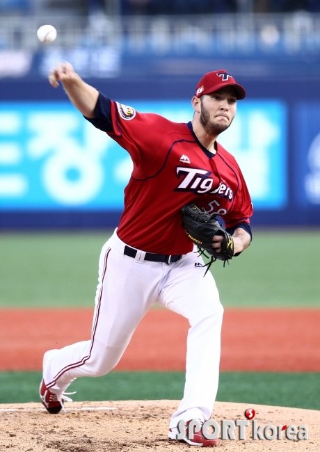 7일 오후 창원 마산야구장에서 열린 ‘2015 타이어뱅크 KBO 리그’ NC 다이노스와 KIA 타이거즈의 경기 1회말에서 KIA 선발투수 스틴슨 역투하고 있다.