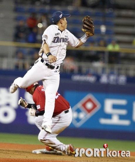 7일 오후 창원 마산야구장에서 열린 ‘2015 타이어뱅크 KBO 리그’ NC 다이노스와 KIA 타이거즈의 경기 6회초 2사 1루에서 KIA 이범호가 2루도루에 성공하고 있다.