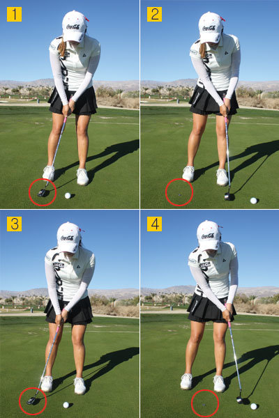 1,2. 퍼터의 헤드 뒤쪽에 동전을 올려놓고 스트로크 해보자. 동전이 공의 뒤쪽(오른발)에 떨어지면 손목을 많이 쓰고 있거나 또는 스트로크의 속도가 천천히 올라갔다가 빠르게 진행되고 있다는 것을 의미한다. 3,4. 스트로크의 속도를 일정하게 유지하면 동전은 공이 놓여있던 지점에 떨어진다. 이 상태를 유지해 계속 연습하면 훨씬 부드럽고 매끄러운 퍼트 스트로크를 만들 수 있다.