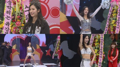 하지만 매력발산 코너에서 음악이 나오는 동시에 외투를 벗어 던지더니 안에 입고 있던 치어리더 옷을 공개하며 화려한 치어리딩을 선보였다.
