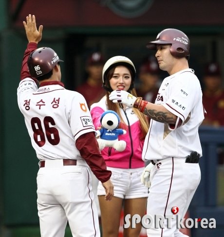 8일 오후 서울 목동야구장에서 열린 ‘2015 타이어뱅크 KBO 리그 프로야구’ 넥센 히어로즈 대 KIA 타이거즈 경기 1회말 2사 1루에서 넥센 박병호가 선제 투런홈런을 쳐 홈을 밟은 후 정수성 1루코치의 환영을 받고 있다.