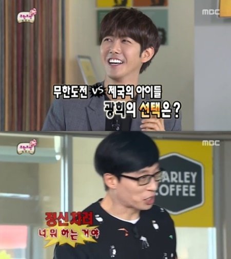 이에 광희는 아주 짧은 고민 끝에 “무한도전”이라고 대답해 웃음을 자아냈다. 이에 놀란 유재석은 “제국의 아이들을 해야지. 왜 무한도전을 하냐”라며 지적했다.