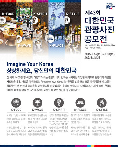 공모 주제는 관광슬로건 ‘이매진 유어 코리아’(Imagine Your Korea)로, 한국의 가치와 매력을 알릴 수 있는 다섯 가지 키워드, K-FOOD, K-WAVE, K-SPIRIT, K-PLACE, K-STYLE에 맞는 사진이어야 한다.