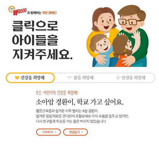 다음카카오 사회공헌 서비스 ‘다음 희망해’와 공동으로 진행하는 이번 캠페인은 ‘클릭으로 아이들을 지켜주세요’라는 주제로 7월 말까지 실시한다. ‘다음 희망해’ 페이지의 응원 댓글과 SNS 공유를 통해 어린이에 대한 응원 메시지를 전하면 광동제약이 네티즌의 참여만큼 기부금을 적립해 돕는 방식이다.