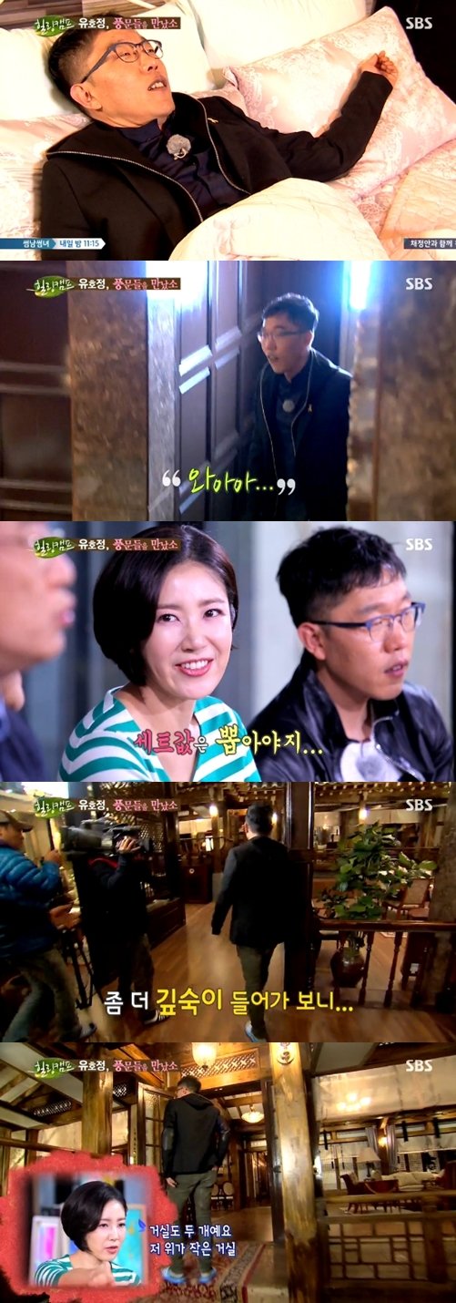 김제동은 세트장의 거실을 본 뒤 “워낙 넓어서 어디가 식당이고 어디가 거실인지도 모르겠다”고 말했다. 그는 극중 고아성의 침실을 찾아가더니 “어디가 고아성이 누웠던 자리냐”고 물은 뒤 침대에 바로 누웠다. 이에 이경규는 “무슨 행동이냐”고 따져 웃음을 자아냈다.