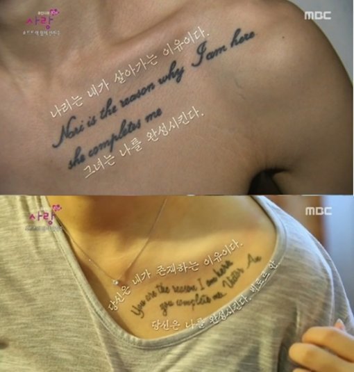 우나리 역시 쇄골에 새긴 ‘당신은 내가 존재하는 이유다. 당신은 날 완성시킨다. 빅토르 안’이라는 문신을 공개하며 “여기 와서 새긴 거다. 우리가 제일 좋아했던 영화 ‘제리 맥과이어’ 한 장면의 대사다”라고 설명했다.