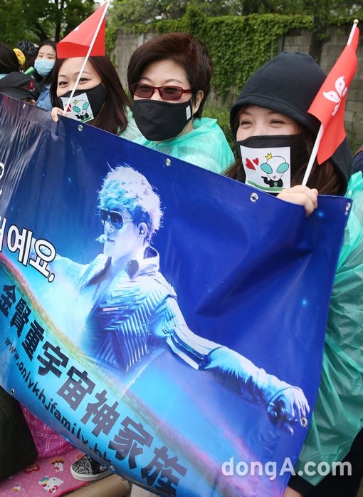 이들은 최근 김현중의 팬카페와 각종 커뮤니티를 통해 이를 계획한 것으로 알려졌다. 입대 당일 날 초록 우의를 입고 모이자는 내용을 담은 글들이 게재됐고, 실제로 현장에는 초록 우의를 입은 팬들이 넘쳐났다. 팬들은 하나같이 “우리는 김현중 만의 팬입니다”라는 문구가 담긴 피켓을 들고 있는 모습이었다.