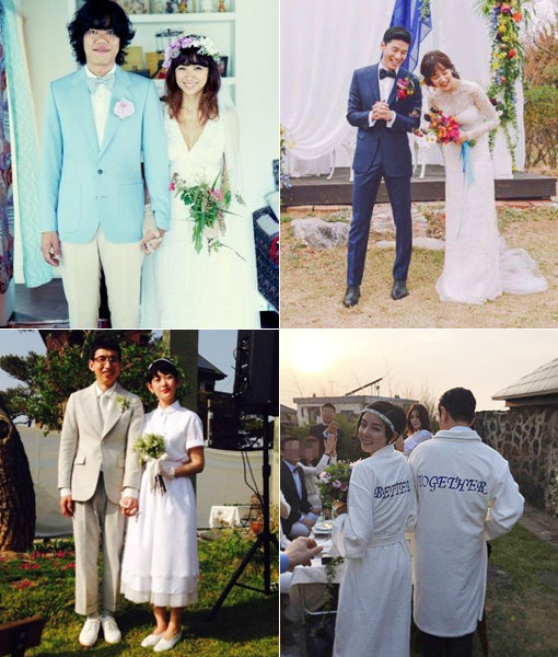 특급호텔 결혼 대신 각자의 개성을 담은 콘셉트 웨딩을 선택하는 스타들이 늘고 있다. 제주도에서 하우스 웨딩을 진행한 이효리·이상순 부부-김무열·윤승아-김나영-봉태규·하시시박(왼쪽상단 시계방향으로). 사진출처|이효리블로그·윤승아·김나영·봉태규 인스타그램
