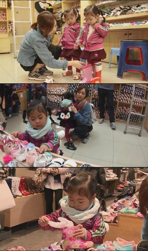 평소 아이들 물건을 살 때 깐깐함을 고집한 슈의 모습이 겹치는 순간이다. 그동안 슈는 라둥이에게 큰 옷을 사서 소매와 바짓단을 접어 입히는 알뜰함을 보이며 시청자들의 눈을 사로잡는다. 엄마를 닮은 라둥이의 꼼꼼함에 엄마 슈는 물론 신발 가게 직원도 감탄을 금치 못했다고.