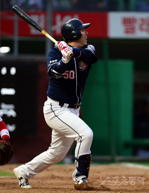 2회초 1사 1, 3루에서 두산 김현수가 SK 김광현을 상대로 좌월 3점 홈런을 쏘아올리고 있다.