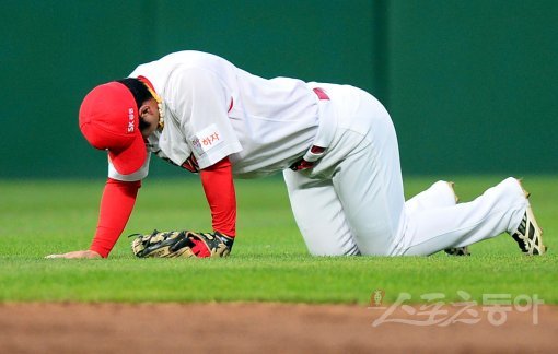 2회초 무사 1, 2루에서 두산 민병헌의 타구를 잡으려다 SK 김성현이 부상으로 고통을 호소하고 있다.