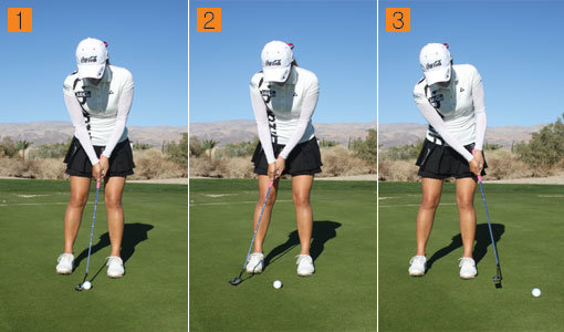 1. 공이 일정하게 굴러갈 수 있도록 퍼터의 헤드를 낮게 유지하면서 스트로크를 시작한다. 2,3. 백스윙과 팔로스루의 크기는 같은 비율로 움직이는 게 좋다. 백스윙보다 팔로스루가 지나치게 크면 스윙의 템포가 빨라지는 실수가 나올 수 있다. 1대1의 비율을 유지하자.