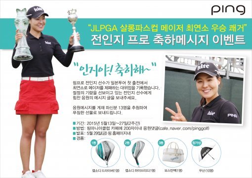 핑골프(www.pinggolf.co.kr)에서는 후원선수인 전인지의 일본여자프로골프(JLPGA) 투어 월드레이디스 살롱파스컵 챔피언십 최연소 우승을 기념해 축하메시지 이벤트를 진행한다.