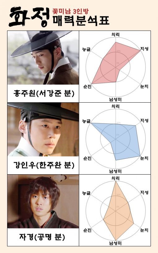 ‘화정’의 꽃미남 3인방, 서강준-한주완-공명의 매력분석표가 공개됐다.