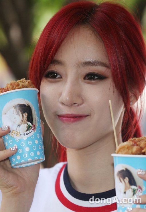 가수 엘시 은정이 16일 오전 서울 마포구 상암동 MBC신사옥 앞에서 열린 '오늘은 은정이가 치킨 쏜다' 행사에 참석하고 있다.