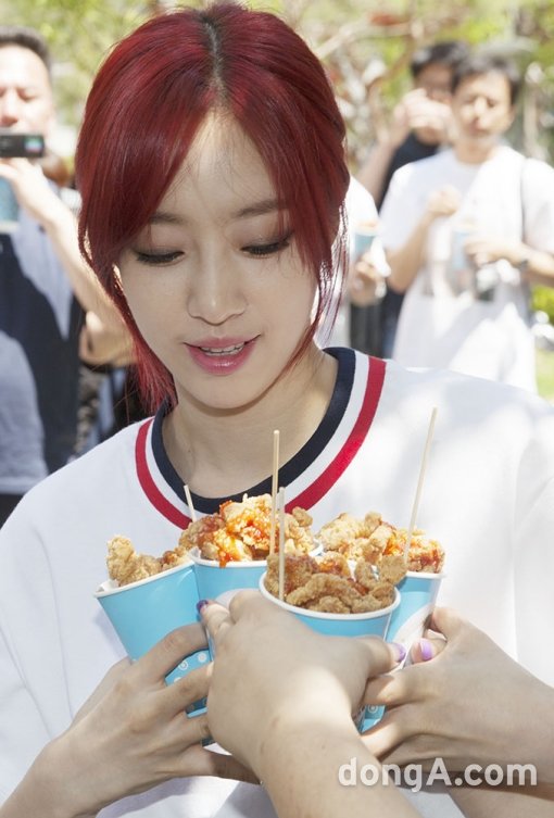 가수 엘시 은정이 16일 오전 서울 마포구 상암동 MBC신사옥 앞에서 열린 '오늘은 은정이가 치킨 쏜다' 행사에 참석하고 있다.