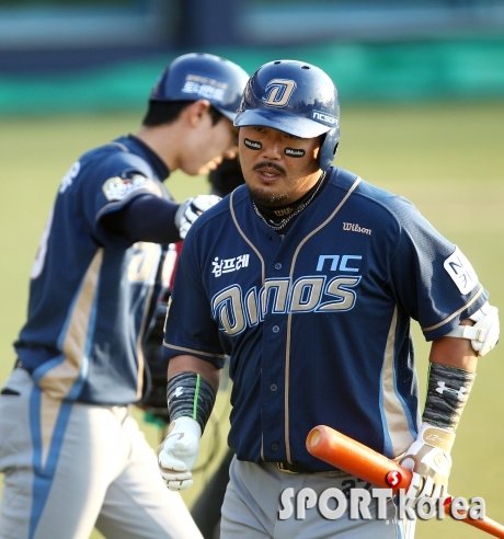 16일 오후 대구 시민야구장에서 열린 ‘2015 타이어뱅크 KBO 리그’ 삼성 라이온즈 대 NC 다이노스 경기 4회초 NC 선두타자 이호준이 솔로홈런을 쳐 홈을 밟은 후 대기타석 김성욱의 환영을 받고 있다.