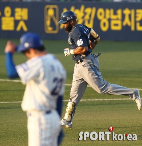 16일 오후 대구 시민야구장에서 열린 ‘2015 타이어뱅크 KBO 리그’ 삼성 라이온즈 대 NC 다이노스 경기 5회초 2사 1루에서 NC 테임즈가 투런홈런을 친 후 그라운드를 돌고 있다.