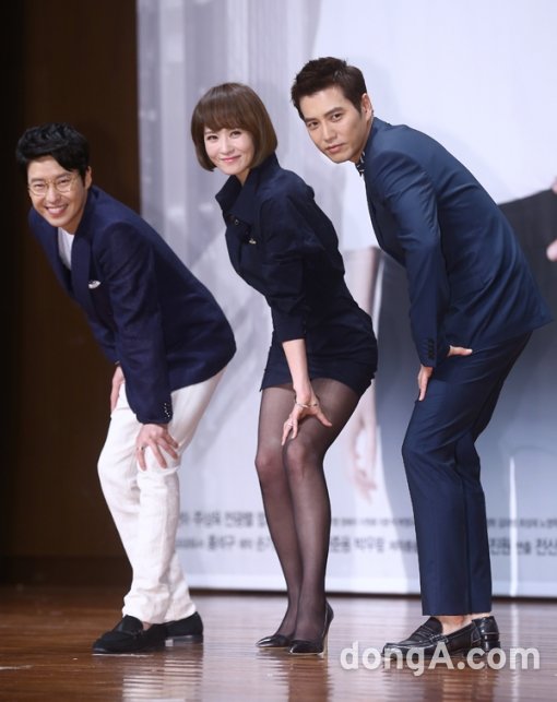 배우 엄기준(왼쪽부터), 김선아, 주상욱이 18일 오후 서울시 영등포구 63컨벤션센터에서 열린 KBS 새 수목드라마 ‘복면검사’ 제작발표회에서 포토타임을 하고 있다.