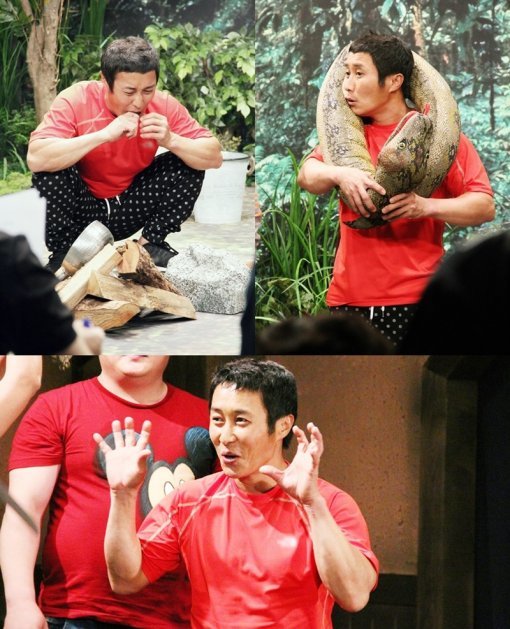 사진 속 김병만은 모닥불 앞에 앉아 실감나는 표정을 지어 보이고 있으며, 목에 뱀 모형을 두른 채 한껏 꽁트 속 상황에 몰입하고 있는 모습이다. 또 다른 사진에서는 크루들과 액션 합을 맞춰보며 미소를 띈 채 능청스럽게 리허설에 임하고 있어 눈길을 끈다.