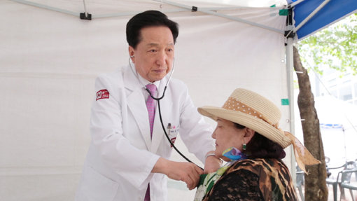 에이치플러스 양지병원 김철수 이사장이 17일 열린 ‘나눔진료’ 행사에 참가해 환자들을 진료하고 있다. 사진제공|에이치플러스 양지병원