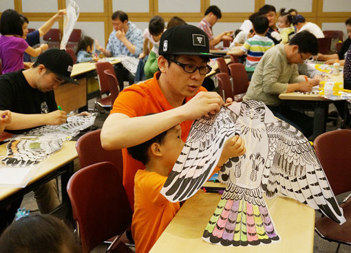 SK플래닛 11번가가 9일 임직원 가족을 대상으로 한 가정의 날 행사를 진행하는 등 국내 주요 기업들이 5월을 맞아 소속 직원들과 가족을 위한 다양한 프로그램을 마련했다. 프로그램에 참여해 아이와 함께 연을 만들고 있는 11번가 직원. 사진제공|11번가