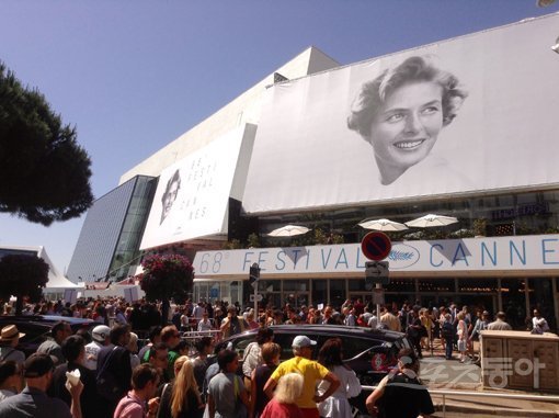제68회 칸 국제영화제가 열리는 뤼미에르 대극장과 드뷔시 극장 모습. 탄생 100주년을 맞은 잉그리드 버그만의 모습이 담긴 올해 칸 공식 포스터로 장식돼 있다. 칸(프랑스)|이해리 기자 gofl1024@donga.com
