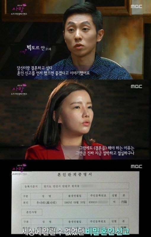 이날 안현수는 “(우나리에게)당신이랑 결혼하고 싶다. 혼인신고를 먼저 했으면 좋겠다고 이야기했다”고 말했다.