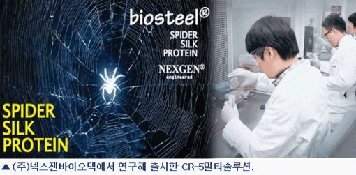 ㈜넥스젠바이오텍에서 제조한 CR-5(씨알파이브) 솔루션이 “인공거미줄단백질”(Spider Silk Protein) 성분으로 한 층더 업그레이드 되었다고, 유통판매처인 ㈜모두씨앤아이이에서 밝혔다. 차세대 생명공학을 추구하는 ㈜넥스젠바이오텍은 재조합단백질 연구·개발·생산기술을 바탕으로 설립된 생명공학기업이다. 2005년 산업자원부로부터 대한민국 10대 신기술 기업으로 선정 및 국가지정연구실로 지정됐고 지난해 5월에는 국내 처음으로 자체 개발한 ‘인공거미줄 단백질’이 국제화장품원료집에 등재되기도 했다. ‘인공거미줄 단백질’은 콜라젠을 대체하는 피부탄력 소재로서 기존 CR-5(씨알파이브) 보다 더욱 강력한 성능 효과로 소비자에게 다가갈 것으로 기대된다.