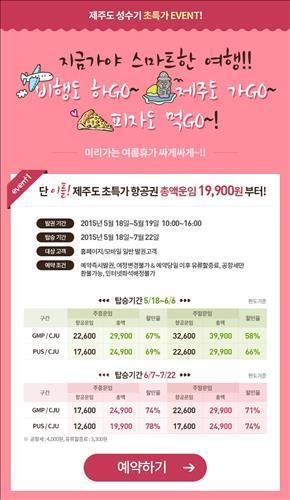 제주도 초특가 항공권의 편도 기준 총액운임(기본운임, 유류할증료, 공항시설이용료 포함)은 부산∼제주는 1만9900원부터이다. 김포∼제주는 2만4900원부터다.