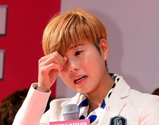 여자축구대표팀 전가을이 18일 서울 광화문 KT올레스퀘어에서 열린 ‘2015캐나다여자월드컵 출정식 토크콘서트’ 도중 눈물을 흘리고 있다. 김진환 기자 kwangshin00@donga.com