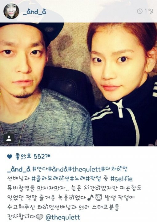 안다(ANDA)는 최근 자신의 인스타그램을 통해 “더 콰이엇 선배님과 콜라보레이션 작업 중 Selfie. 늦은 시간이었지만 피곤함을 느낄 수 없을 정도로 즐거웠던 녹음! 밤샘 작업에 수고해주신 콰이엇 선배님과 여러 스태프 분들 감사합니다” 라는 글과 함께 더 콰이엇(The Quiett)과 함께 촬영한 사진을 공개해 눈길을 끌었다.