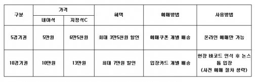 또한, 10경기권의 경우 지정석C는 13만원, 내야석은 10만원에 판매하며 최대 7만원까지 할인혜택이 주어진다.