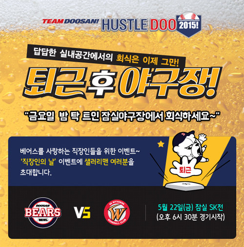 프로야구 두산베어스가 22일(금) 잠실에서 열리는 SK와의 홈경기에 ‘직장인의 날-퇴근 후 야구장으로!’ 특별 이벤트를 실시한다.