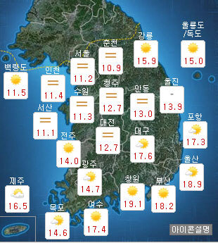 기상청에 의하면 중국 북부지방에서 확장하는 고기압의 영향으로 전국이 대체로 맑겠지만, 북쪽에서 찬 공기가 들어와 기온이 큰 폭으로 떨어지겠다.