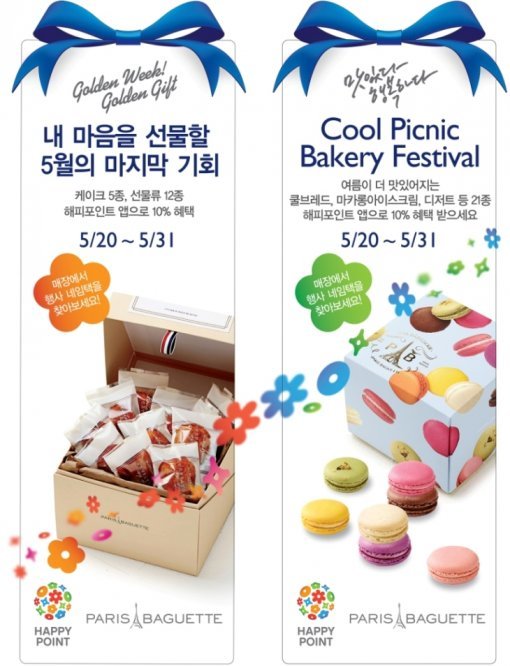 ㈜파리크라상의 대표 브랜드 파리바게뜨가 20일부터 31일까지 이벤트를 진행한다. 이벤트는 ‘Golden Week! Golden Gift’와 ‘Cool Picnic Bakery Festival’ 두 종류로 해피포인트 앱을 이용하는 고객에게 행사 제품 10% 할인 혜택을 제공한다.