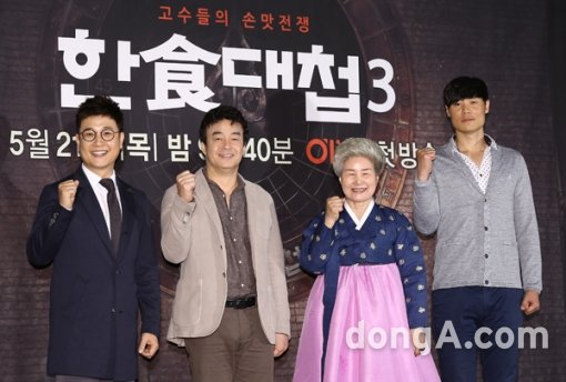 방송인 김성주(왼쪽부터), 심사위원 백종원, 심영순, 최현석, 현돈 PD가 20일 오후 서울 마포구 상암 DMS 다목적홀에서 열린 올리브TV '한식대첩3' 제작발표회에서 포토타임을 하고 있다.