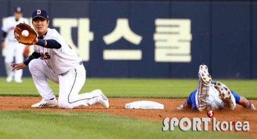 20일 오후 서울 잠실야구장에서 열린 ‘2015 타이어뱅크 KBO 리그’ 두산 베어스 대 삼성 라이온즈 경기 3회초 무사 1루에서 삼성 이지영 타석 때 1루주자 박해민이 도루를 성공하고 있다.