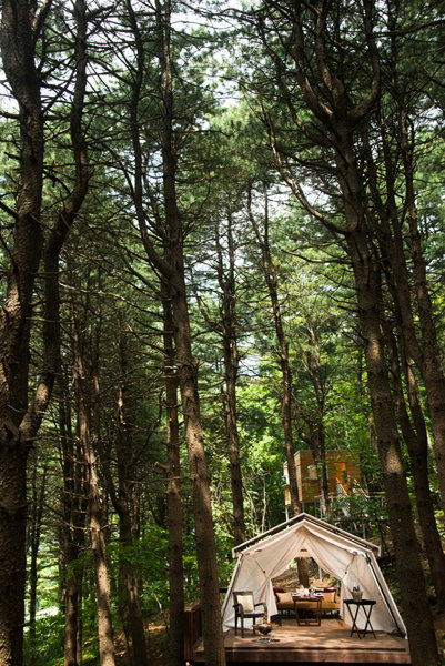 클럽 하우스 수영장 옆의 100년 수령 잣나무 숲에 마련한 아난티 포레스트 힐링 존에는 10개의 텐트와 가족이 함께 즐길 수 있는 다양한 액티비티 시설을 갖추고 있다.
